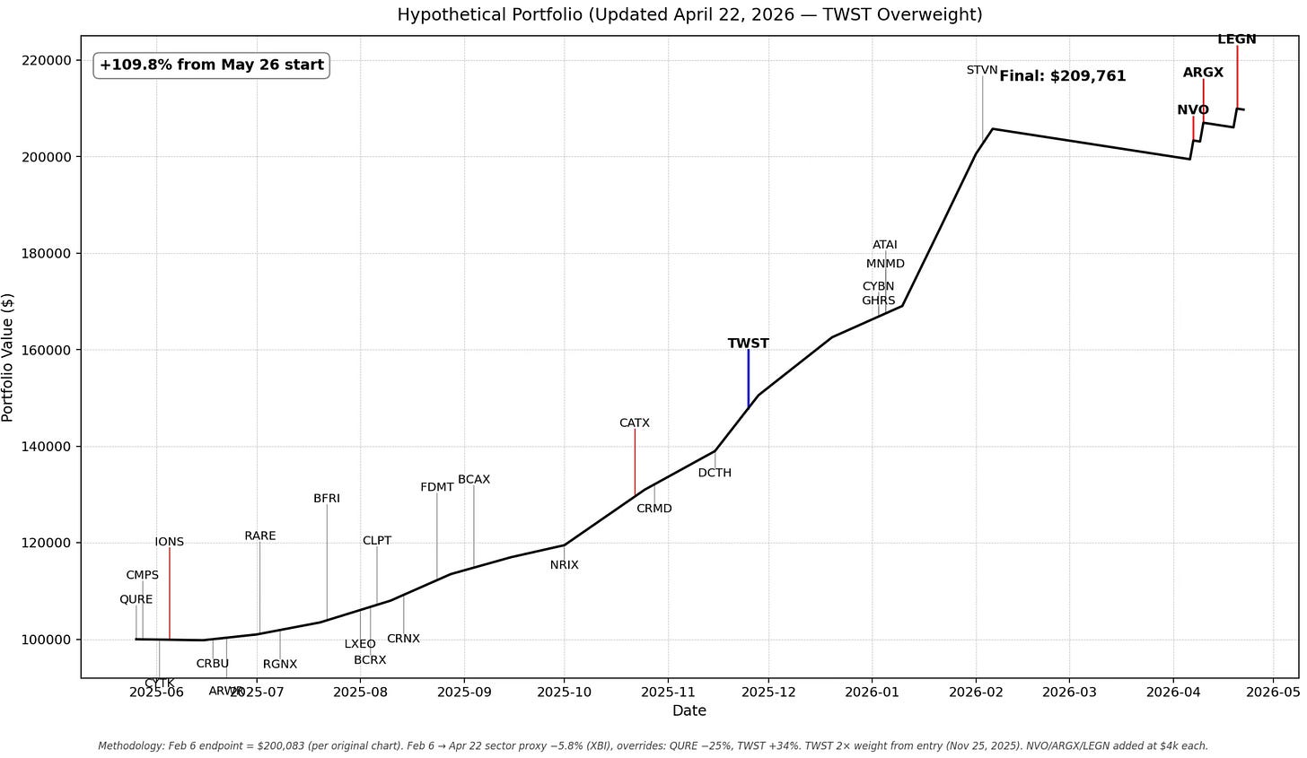 Hypothetical equal-weight portfolio of timestamped picks since May 2025. TWST sized 2×. Returns approximated from public price data; actual investor returns vary with sizing and timing
