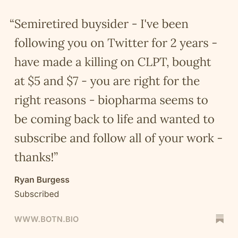 Back of the Napkin Bios is a signal platform for biotech investors. Timestamped, high-conviction ideas backed by primary source research. Used by buyside analysts, fund managers, and sophisticated retail to find asymmetric setups. My readers have seen significant returns and rely on my proximity and insight to navigate complex biopharma markets.