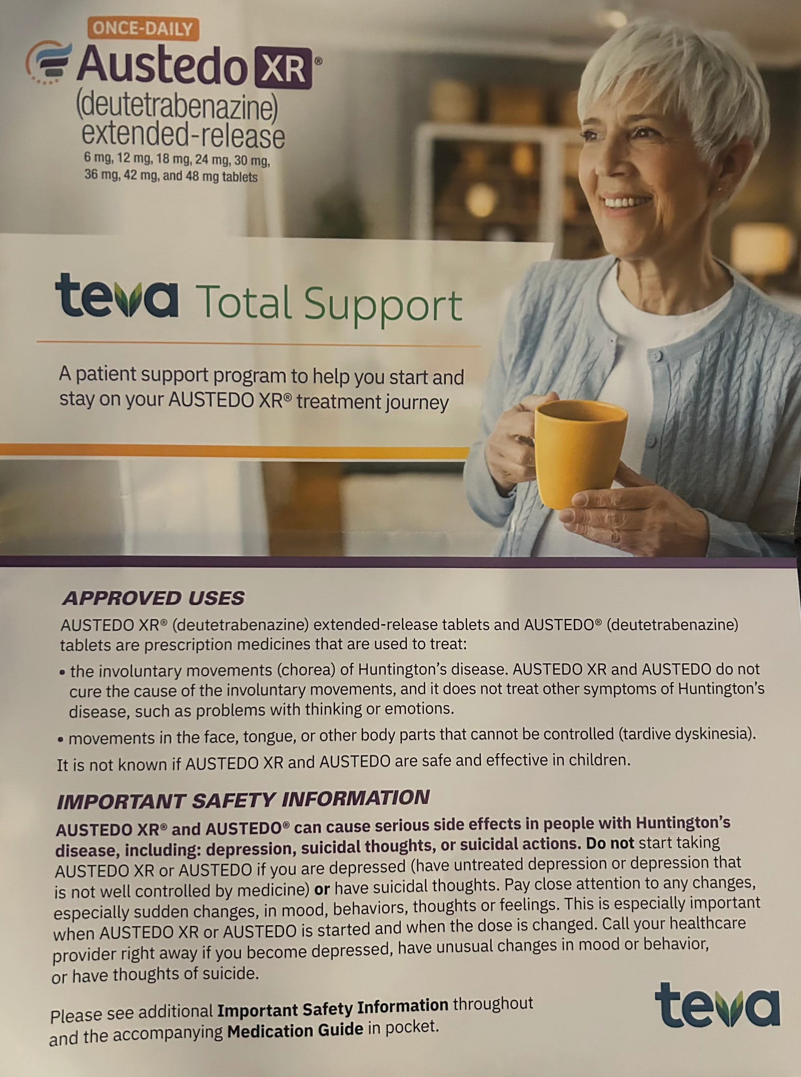 Teva had brochures present for Austedo XR (deutetrabenazine extended-release) which is one of the only FDA-approved treatments for chorea associated with Huntington’s disease. It is worth pausing on what Austedo XR actually is and is not, because the honest accounting of the current standard of care in HD is directly relevant to understanding what is at stake with AMT-130. Austedo XR manages the involuntary movements that are one of the disease’s most visible and physically debilitating symptoms. It does not modify the disease and does not slow progression. It does not address the cognitive or psychiatric dimensions of HD. The language in Teva’s own materials is precise on this point: Austedo XR does not cure the cause of the involuntary movements and does not treat other symptoms of Huntington’s disease, such as problems with thinking or emotions. What Teva is offering is a symptom management tool in a disease that, in the complete absence of any disease-modifying intervention, moves in one direction and ends in one way. That is the current standard of care. That is what patients have access to right now. Keeping that reality clearly in view is essential to understanding the moral weight of what it means to obstruct access to something that might actually change the trajectory of the disease itself.