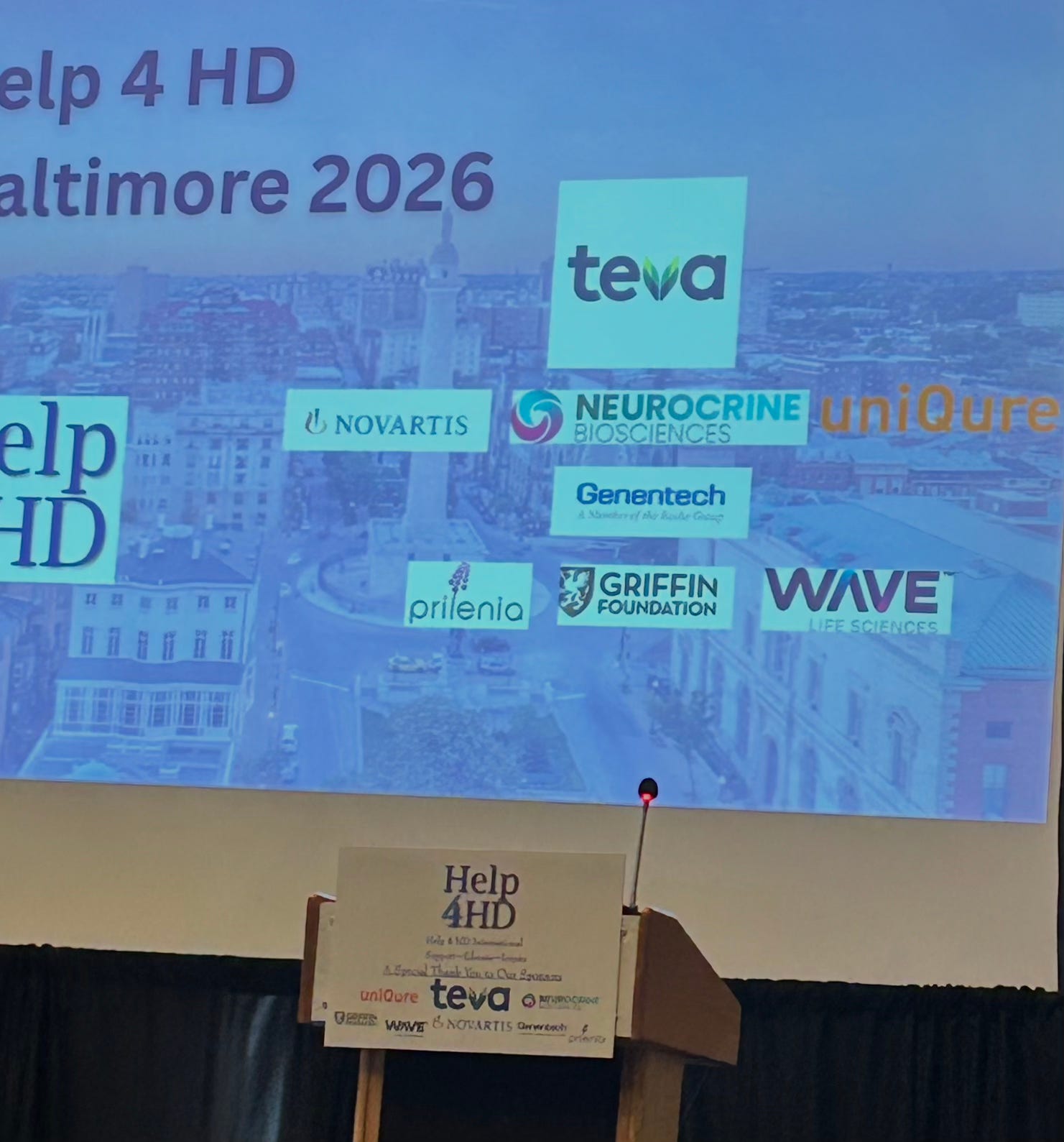 [Photo: Help4HD Baltimore 2026 sponsor slide — uniQure, Teva, Novartis, Neurocrine Biosciences, Genentech, Wave Life Sciences, Prilenia, Griffin Foundation]