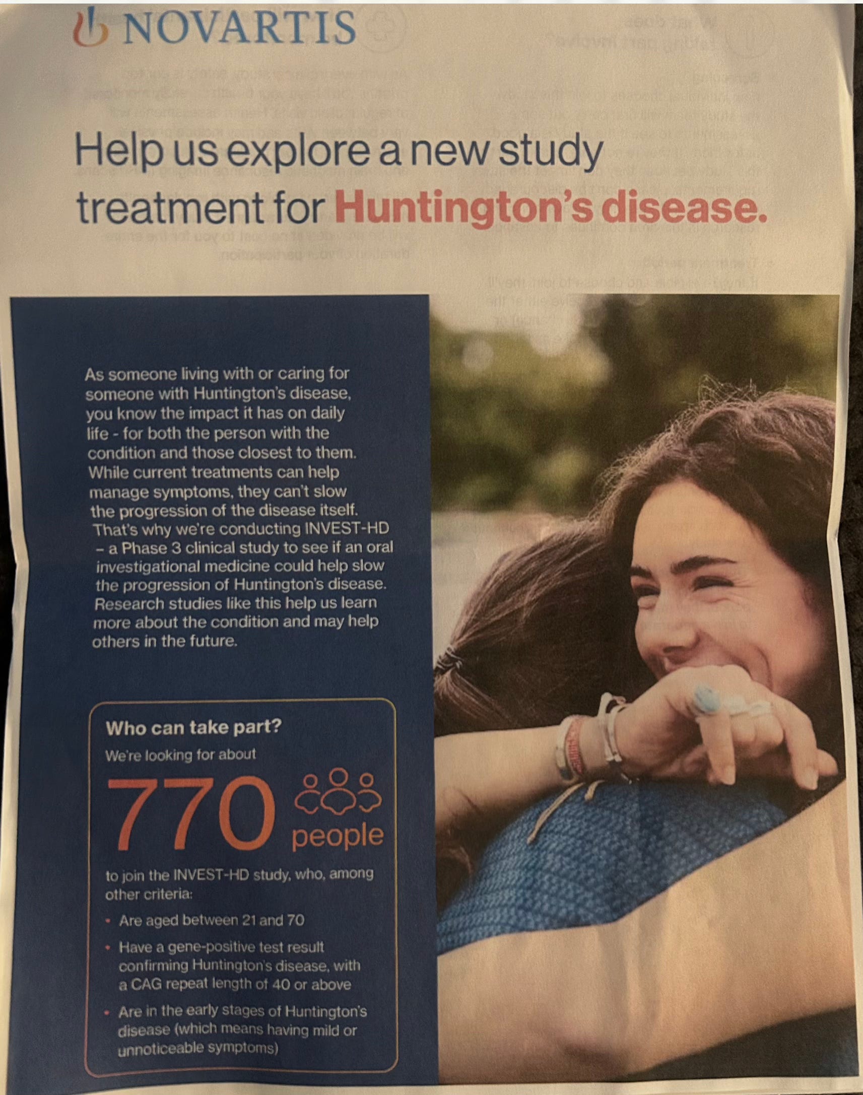 [Photo: Novartis INVEST-HD Phase 3 study recruitment brochure]