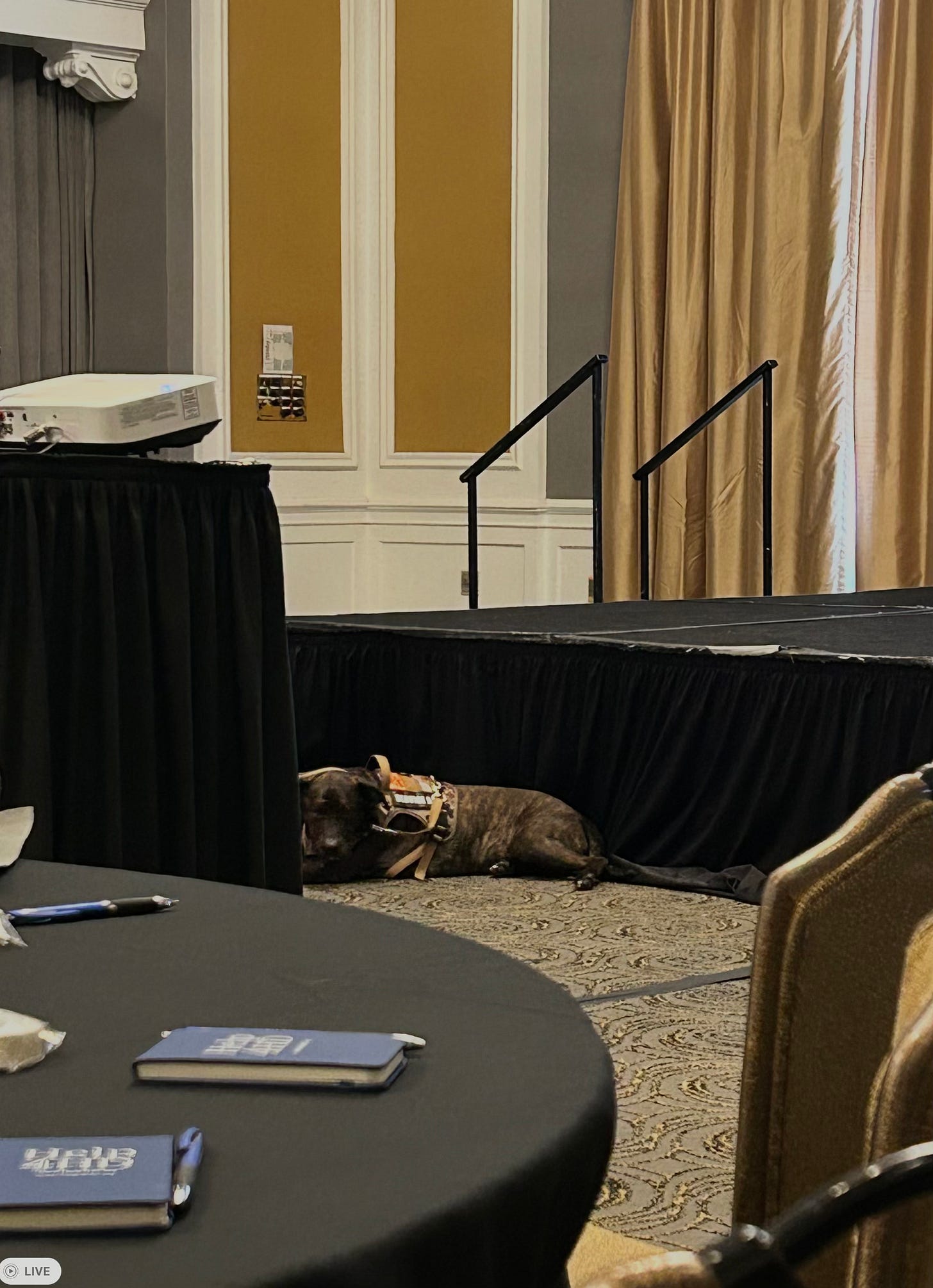 Near the front of the stage, a service dog slept quietly on the carpet throughout the morning sessions. I took a photograph of it. I find it difficult to fully articulate why that image stayed with me, except that it seemed to capture something true about the texture of the day: the presence of something steady and devoted and undemanding in a room full of people who carry an enormous amount.